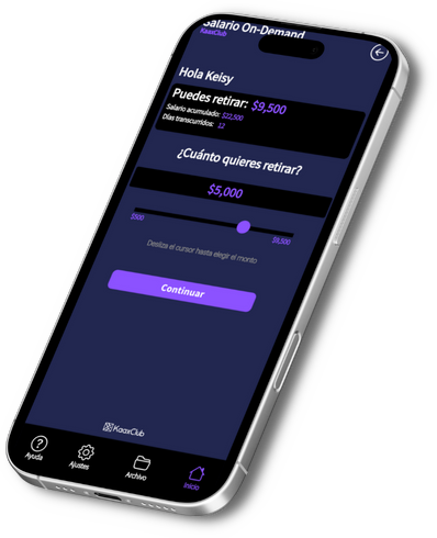 Liquidez inmediata cuando la necesitas. Con Salario On-Demand, accede a tu salario ya trabajado antes del día de pago, sin generar intereses ni complicaciones.